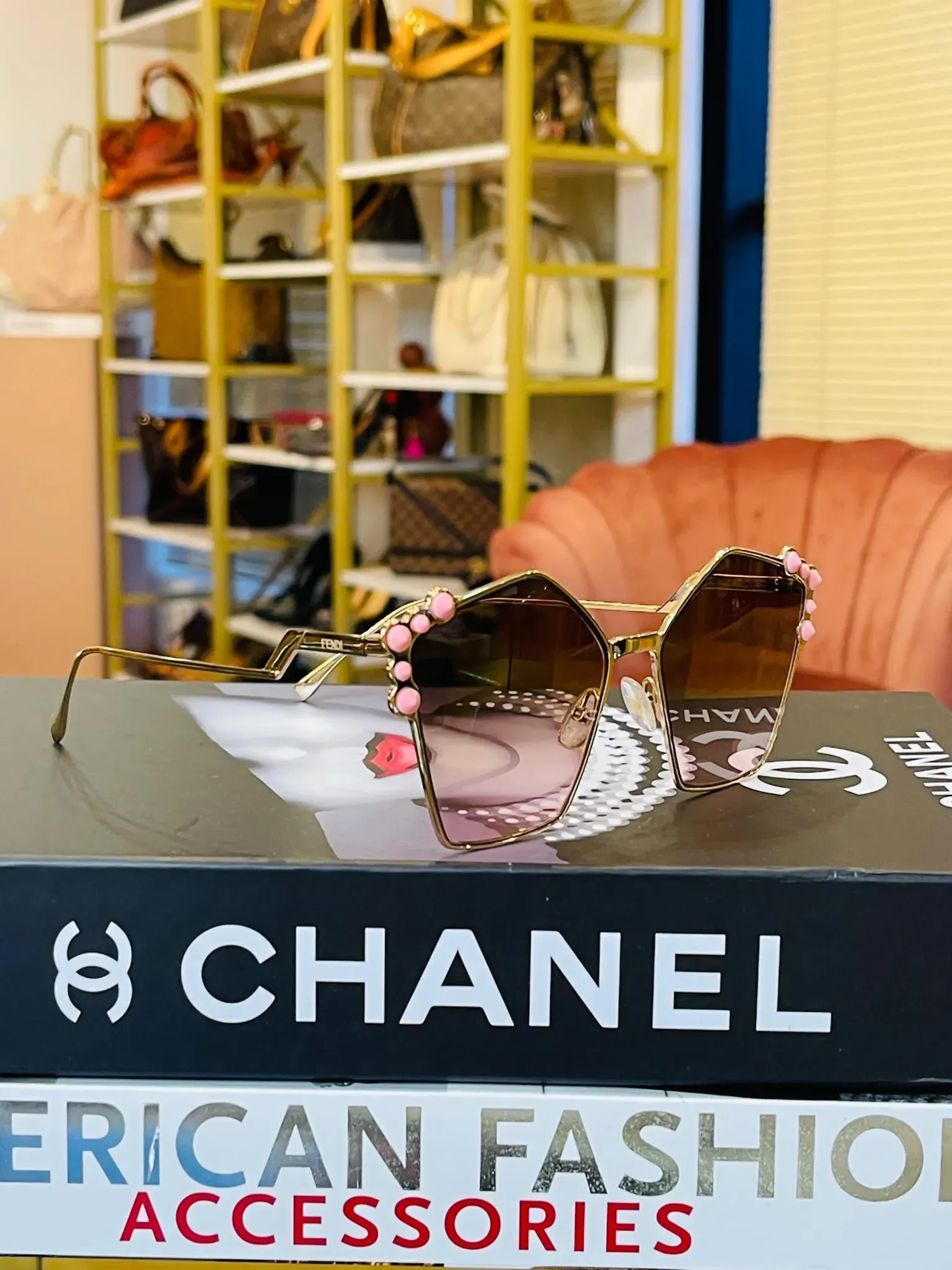 Un par de gafas de sol descansa sobre un libro de accesorios de moda americana de Chanel. Estas elegantes gafas de sol son el complemento perfecto para cualquier outfit, brindando estilo y protección a tus ojos. ¡Haz una declaración de moda con este exclusivo accesorio de alta calidad!