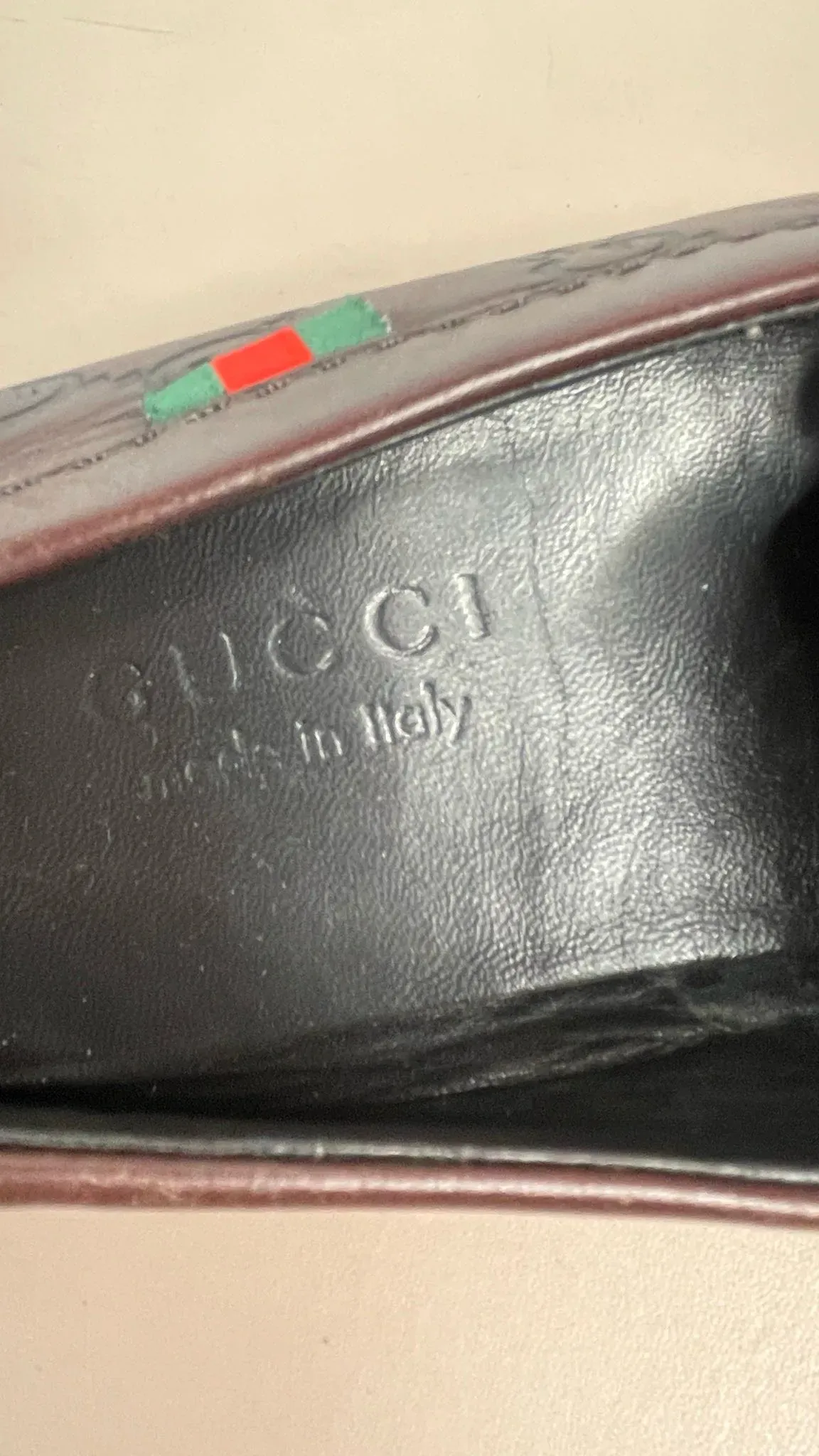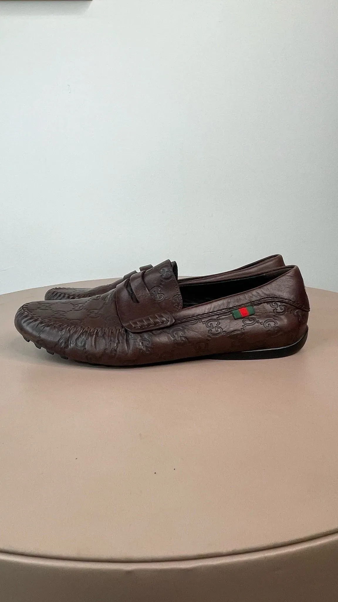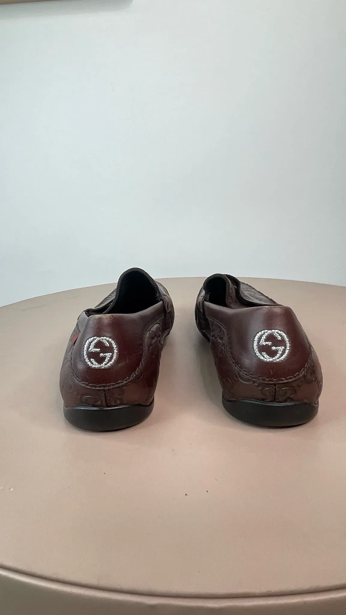 Estos elegantes mocasines Gucci de cuero Guccissima en color marrón oscuro son el complemento perfecto para cualquier atuendo. Con el icónico patrón GG de la marca, estos zapatos ofrecen estilo y calidad incomparables. Ideal para lucir sofisticado y a la moda en cualquier ocasión.
