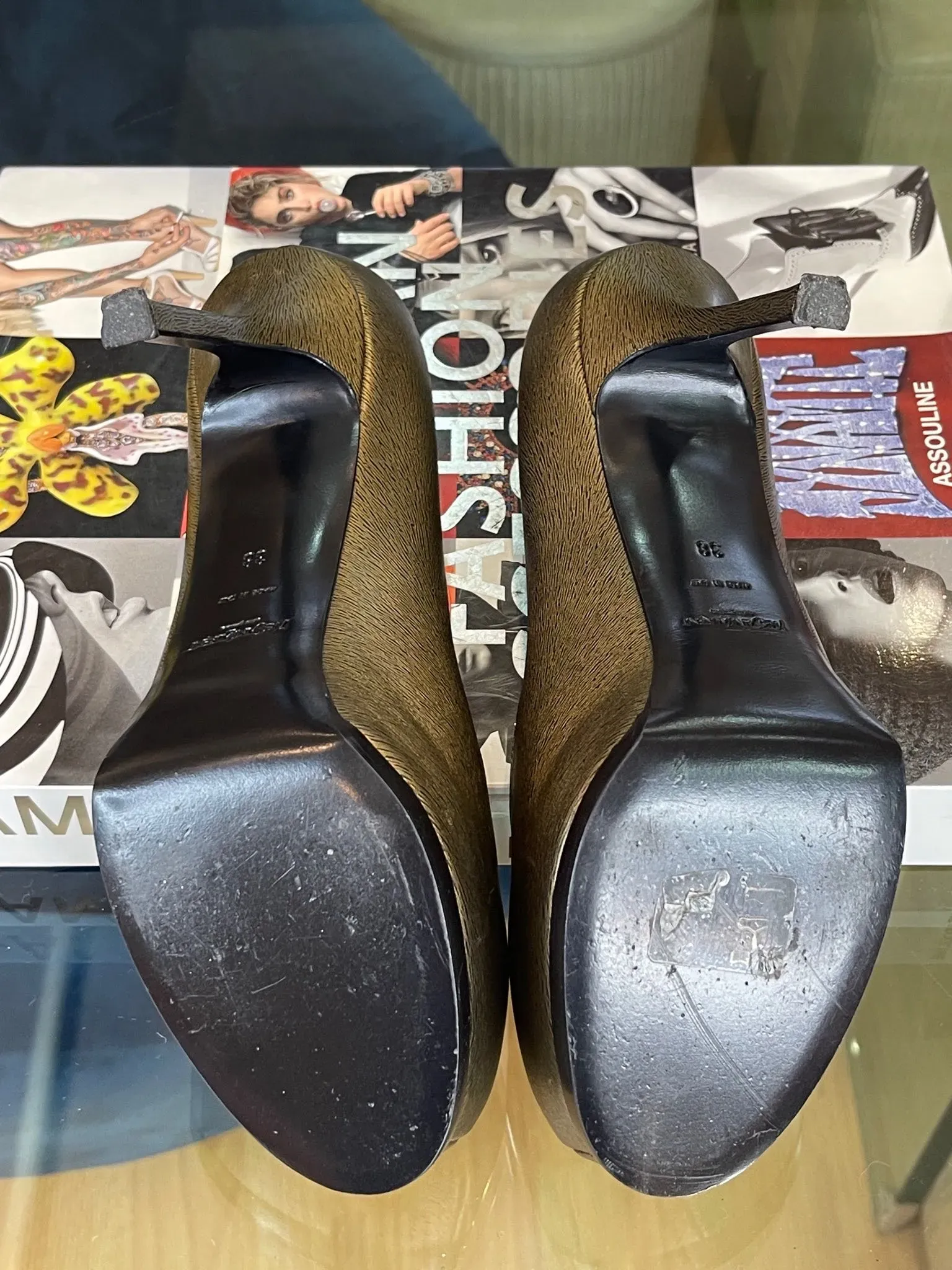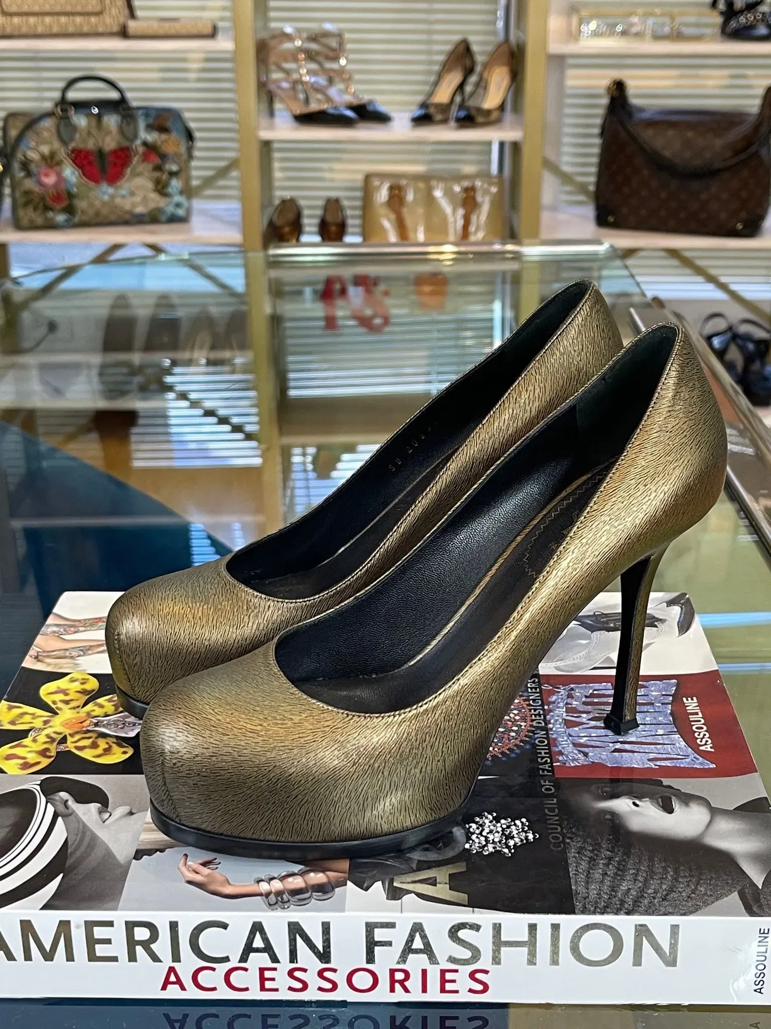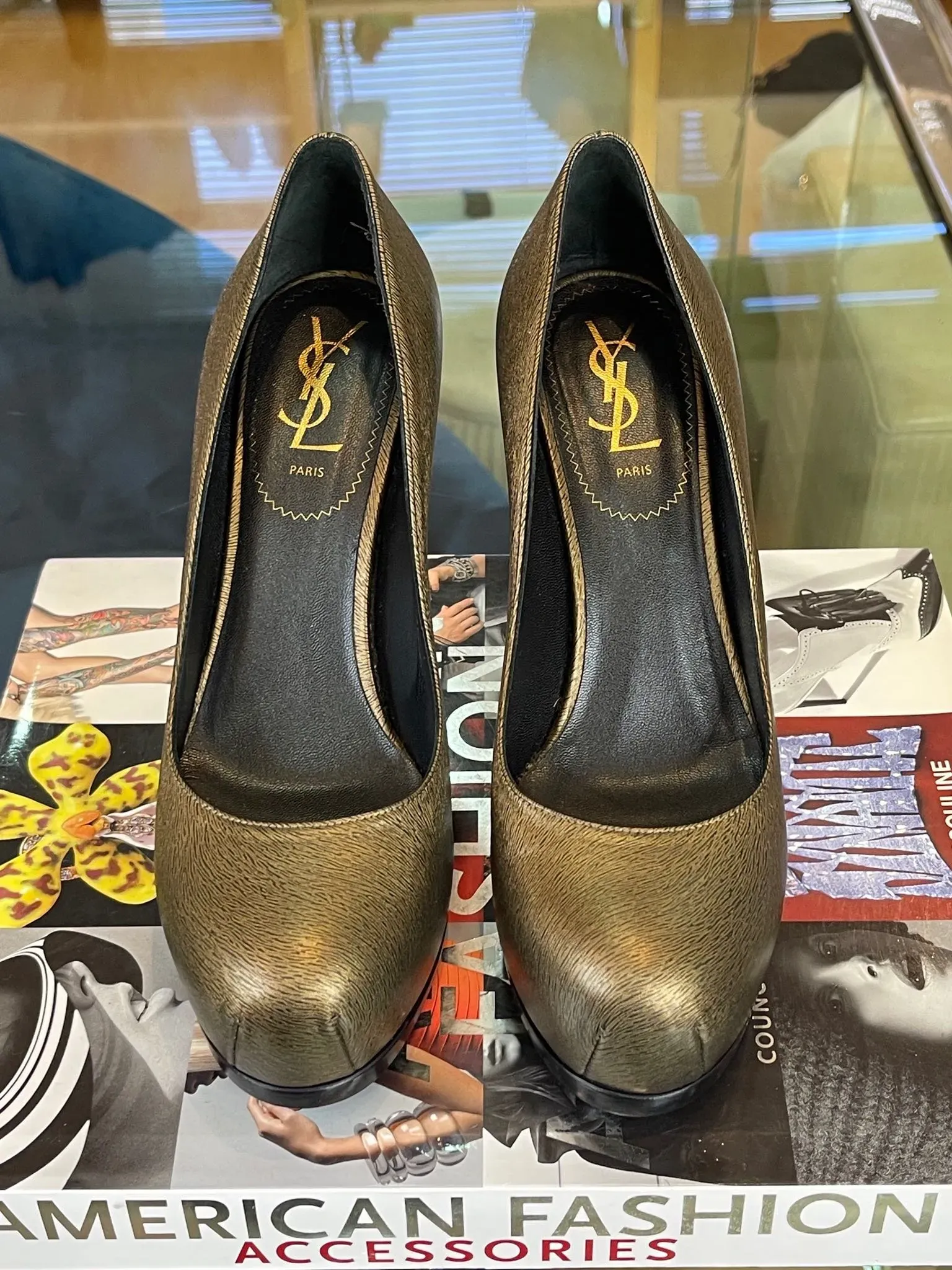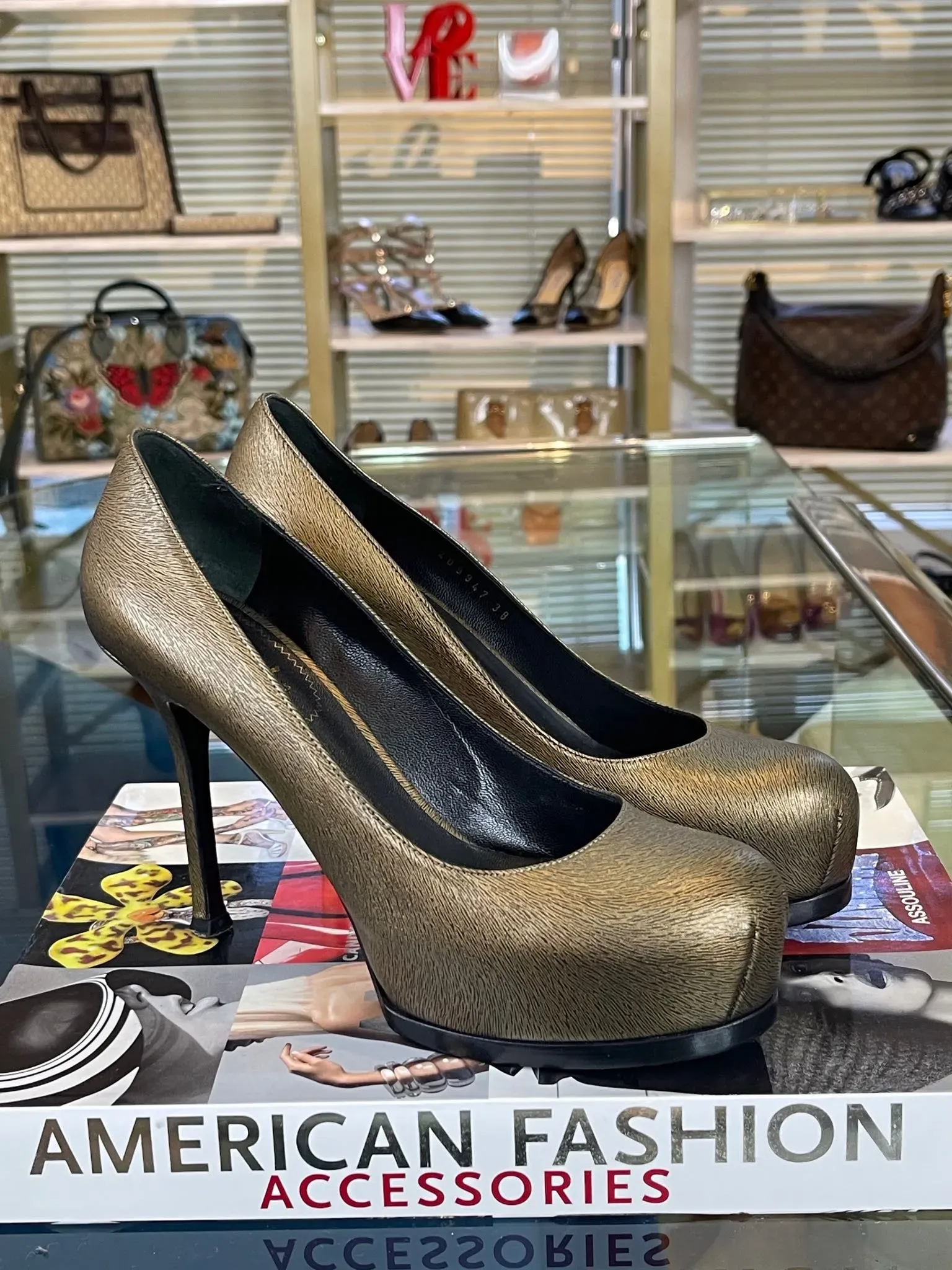 Elegantes y sofisticadas bombas de cuero YSL en talla 38, perfectas para lucir un look chic y moderno. Confeccionadas con materiales de alta calidad, estos zapatos son ideales para cualquier ocasión especial. ¡Destaca tu estilo con estos impresionantes zapatos de diseñador!